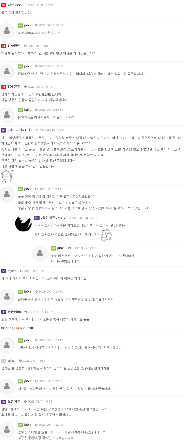 안녕하세요 저는 달인 여행을 처음 가봤고 일행 없이 혼자 다녀왔습니다. 저는 유흥보다는 휴양을 목적으로 느슨한 일정을 부탁드렸고, 그렇기에 다른 분들 보다 일정이 조금 비어 보일 수 있습니다. 때문에 처음 이용하시는 분들에게 이러한 콘텐츠들이 있다는 …
