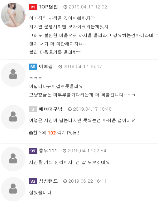 달인여행을 이용한다는건머니머니해도 처음은 안전입니다파트너와의교감은 두번째라 생각합니다^^그냥가서도 놀수있고 꼬실수.있습니다하지만 만약이 존재한다면(신고,레이디보이등)다른문제가 될수 있습니다저 역시 유부남이기에 안전을 목적으로달인을 이용하기에 저에게 사진은 이렇게밖에 못…